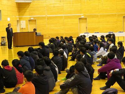 今日6年生は中学校で行われた「知事出前ゼミ」に参加しました。蒲島知事は、「逆境の中にこそ夢がある」と題して、「人生の可能性は無限大。逆境の中にあっても夢があればやることができる。夢に向かって一歩を踏み出すことが大事。」と、子どもたちに話されました。