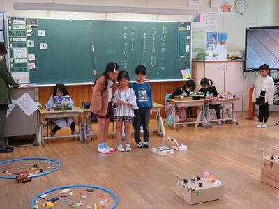 1年生の生活科では保育園との交流が行われました。秋の自然物で作ったおもちゃで、年長さんに楽しんでもらいました。名付けて「「わんだふるランドへようこうそ」です。