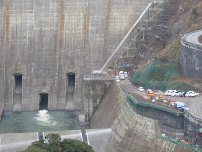 立野を出発すると、ダム工事の場所を見ることができるように列車が一時停車しました。ダムの大きさに子どもたちは驚いていました。