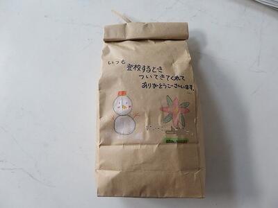 終業式を迎えるにあたって嬉しいことが2つありました。昨日、5年生から思いがけないプレゼントをもらいました。そのプレゼントは、米作り体験のお米です。5年生はJA・保護者の方々にお世話になり、田植え・草取り・稲刈りを体験しました。米作り体験でできたお米を私たち職員もいただきました。