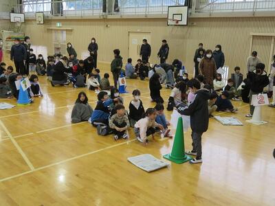 今日のロング業間は、体育館で縦割り班対抗のゲーム「一致団結!じゃんけんゲーム」をしました。