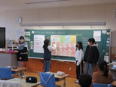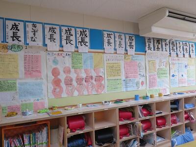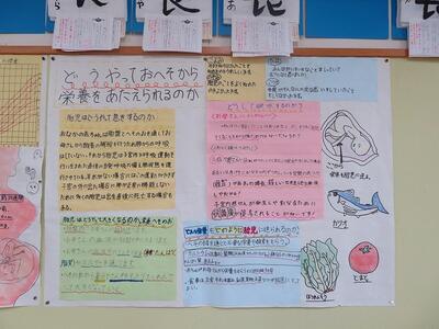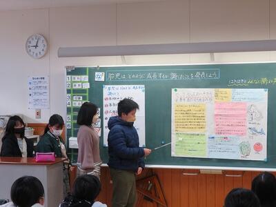 5年生理科では、発表会が行われていました。5つの班が人の誕生について、それぞれ興味を持った内容を詳しく調べての発表でした。調べた内容がとても詳しく、お互いに発表を聞き、学び合うこともできました。お母さんからの聞き取りをまとめたものもありました。5つの班、全てが調べたことを模造紙にびっしりと書いてまとめていました。最後の感想発表では、お互いの発表から学んだこと、はじめって知ったこと、お互いのがんばりを評価する感想が発表されました。