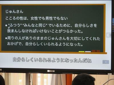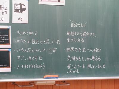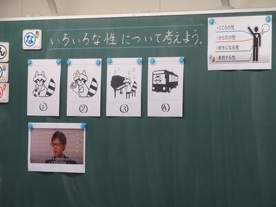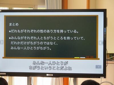 6年生学活(性に関する指導)では、性の多様性について考える授業でした。最近、メディア等において「LGBT」という言葉をよく聞くようになり、「性的マイノリティ(性的少数者)」に対する社会的関心が高まっています。しかし、根強い偏見や差別があり、苦しんでいる人々がいます。また、体の性と心の性に違和感があることに悩みながら、周囲の心ない好奇の目にさらされて苦しんでいる人々もいます。性的マイノリティに該当する人は、3~8%程度いるとされており、35人学級であれば1~3人程度当事者がいる可能性があるともいわれています。そしてこのような子どもたちは、いじめやからかいの対象となったり、不登校となったり、様々な問題が指摘されています。今日の授業では、多様な性について、正しく知り、多様な性のあり方、問題にについて考えることを通して、互いの個性を尊重し、自分や周りの人の大切さを認められる子どもたちになってほしいという目的を持って行われた授業です。初めて知る内容もありましたが、子どもたちはとても真剣に学んでいました。感想には、「前は男は男らしくなどと思っていたけど、性はいろいろあってよいと思った」「いろいろな性を知って、見た目で判断してはいけないことの重大さをあらためて感じた」「前は見た目で判断していたけど、見た目で判断するのではなく、ちゃんと話を聞いて判断しようと思った。差別はいけない」一人一人の人権を大切にすることや、身近なところから変えていくことなど、自分事として考えた感想もあり、子どもたちが大切なことをしっかりと学んだことがよく分かりました。(板書を参考にされてください)