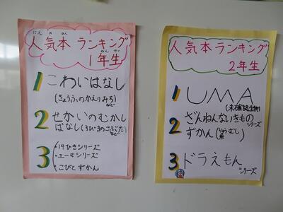 図書室は、好きな本のアンケート結果(学年毎)が発表してあります。