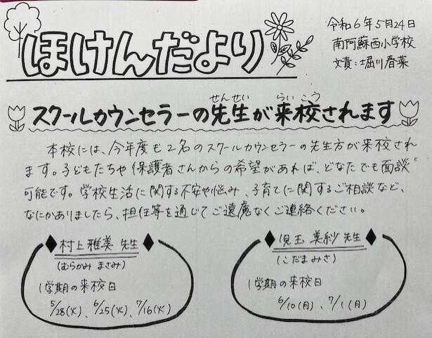 5月24日の「ほけんだより」でもお知らせしましたが、本校は2名のスクールカウンセラー(SC)の先生方が担当されます。