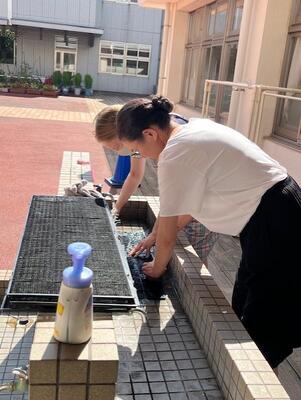 その一方で、職員も校庭の草刈りや残りのエアコン掃除等に取り組んでいます。