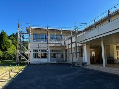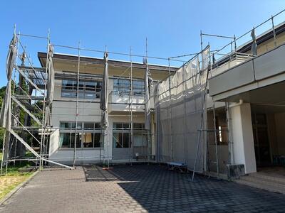 校舎のいたる所で、壁の塗装がはげていたり、ブヨブヨに浮いていたりしてましたが、夏休み中に入ってすぐに足場が組まれ、3週間にわたり塗装工事をしていただきました。