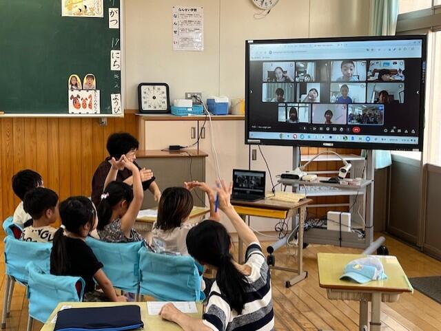 学校の隣にある学童教室から歩いてそれぞれの教室に入り、リモートでつながっている子どもたちと一緒に元気よく健康観察をしています。
