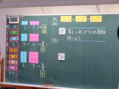 2時間目、6年生の算数は、割合の表し方の学習でした。教育委員会から指導員の先生も参観に来られました。野島先生の指導のもと、子どもたちが集中して学んでいました。指導員の先生からも、たくさん褒めていただきました。