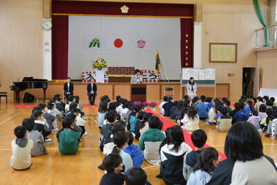 昨年度はリモートでしたが、5年ぶりに体育館で2年生から6年生までがそろって、就任式と始業式を行いました。