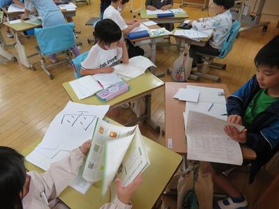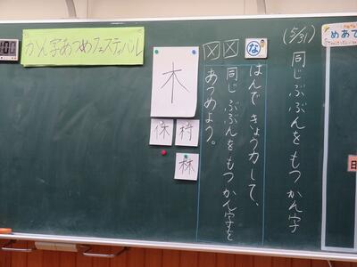 2時間目、2年生では国語の授業が行われていました。学習内容は「班で協力して、同じ部分を持つ漢字をあつめよう」というものでした。「漢字フェスティバル」というネーミングに子どもたちもやる気満々でした。