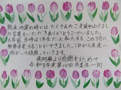 『7月11日【朗報】熊本地震をきっかけに交流のあった南阿蘇村立南阿蘇西小学校からお礼の寄せ書きとコスモスの種が届きました。同封された写真の阿蘇西小学校の子どもたちの笑顔が素敵です。いつかお返事を出そうと思います。南阿蘇西小学校の皆さん、これからもともに笑顔で過ごしましょうね。』