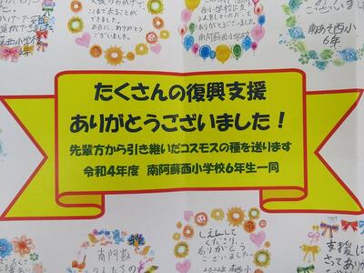 昨日、熊本市の芳野小学校の校長先生からお礼の電話がありました。その内容は、6年生が復興支援のお礼「南西小ありがとうプロジェクト」として、昨年度6年生(現中1)から受け継いだ永井博士のコスモスの種と寄せ書きを送ったものが届いたという連絡でした。