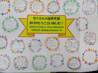 また、そのことを芳野小学校の学校ホームページにも紹介していただいていました。次のような文と一緒にコスモスの種が届いたことが紹介されていました。嬉しくて元気が出る内容でした。