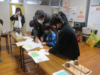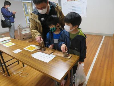 体育館入り口では体験教室も行われました。私もその中で科学実験コーナー「ファラデー塾」のお手伝いを、前校長の山下先生と一緒にしました。