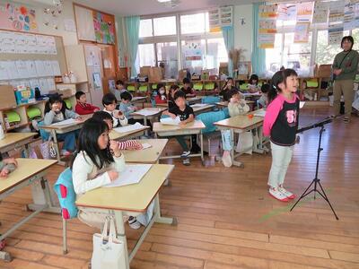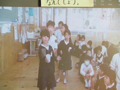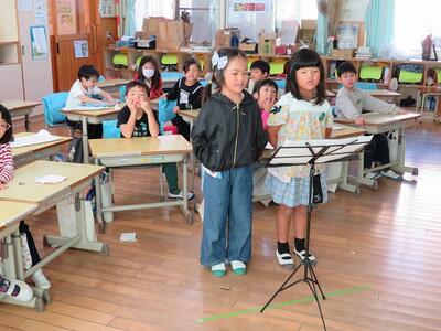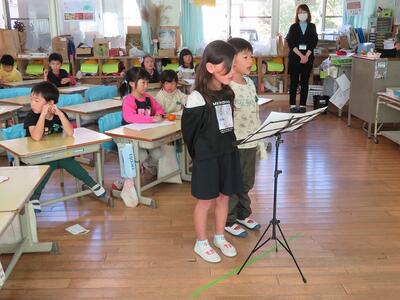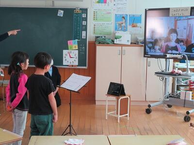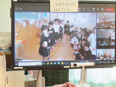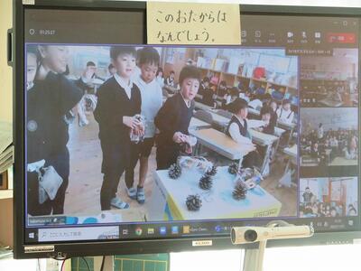南西小からの発表は、「南阿蘇の秋のお宝を伝えよう」ということで、生活科の学習で見つけた南阿蘇の秋(植物等)をクイズにして紹介しました。かき、からすうり、おなもみ、くり、どんぐり等々を10個のクイズにして紹介しました。ペアや3人組で協力して、カメラの向こうの相手にクイズが伝わるようハキハキと大きな声で伝えていました。