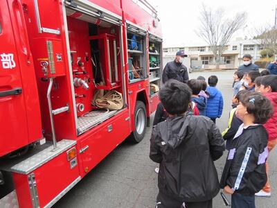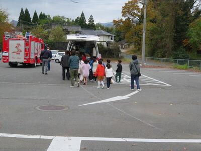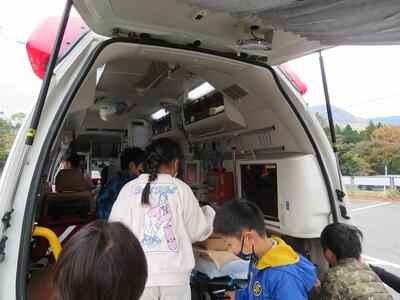 避難訓練が終わった後、1年生から4年生が救急車と消防車を見せてもらいました。消防署の方が、たくさんの質問にも丁寧に答えて下さいました。消防車輌の見学は、毎回させてもらっていますが、いつも興味深く見学する子どもたちです。