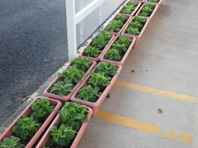 体育館通路に、用務員の吉田先生が大切に育ててくださっているサクラソウが並んでいました。