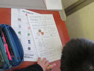 担任の永田先生の見本をもとに、今日の学習の流れと見通しを確認しました。「見通しをもつ」というのはどんな子ども(大人も)にとって大事なことですが、独別支援学級の子どもにとっては、安心して学習を進めるうえで特に重要です。