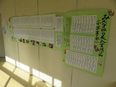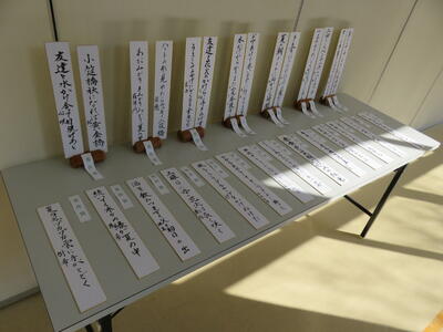 多目的室の前の廊下と壁面には「みんなの俳句展」の作品が展示されています。短冊は、本校の卒業生を含む松岡書道教室の生徒さんが書かれたそうです。見事です。