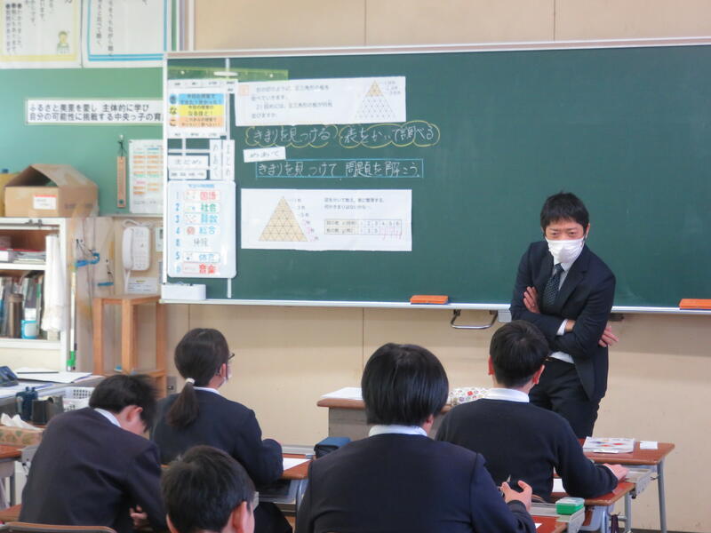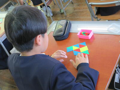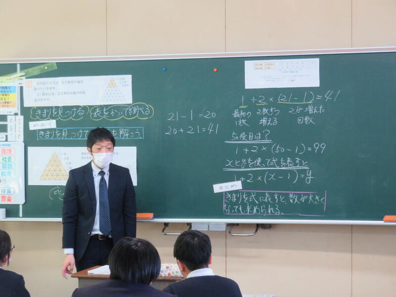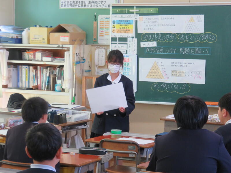 算数の授業でした。三角形の板を敷き詰めて大きな三角形を作っていく時、「何段目までの三角形をつくるには板は何枚必要か」を解決するための決まりを見つける学習でした。
