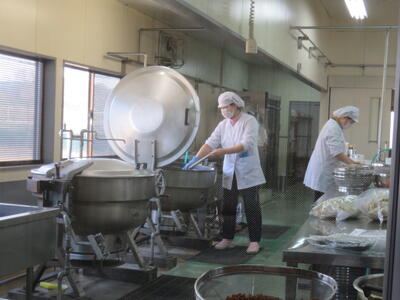 これらの給食は、給食調理員の3名の先生方がチームワークのもと愛情をこめて毎日作っておられる作品です。