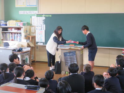 今日が最終日でしたので、代表児童の感謝の言葉とともに、子どもたちが書いたお礼をそれぞれの学級で贈らせていただきました。