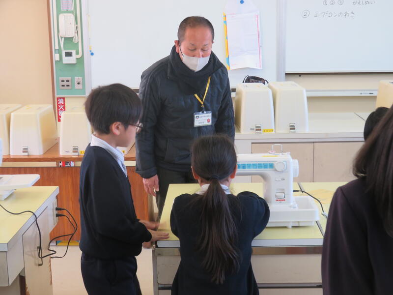 その衣領域の中に、ミシンを使って自分のエプロンを作るという学習があります。最近はミシンをもっていない家庭もかなり多くなり、5年生32名中、ミシンを使ったことのある子どもはわずか2名とのことです。