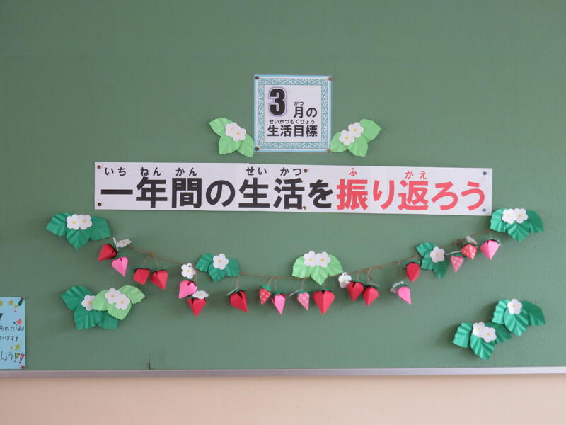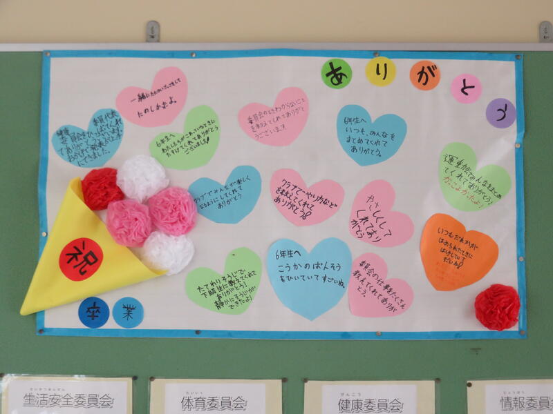 聞くところによると、5年生の有志が6年生の卒業に向けて、感謝の思いを伝えるために、このスペースを活用して作成し、掲示したとか。「思いやり」とか「やさしさ」という簡単な言葉ではとても言い表せない、人間としての愛情があふれ出てくるような掲示物だと感じました。