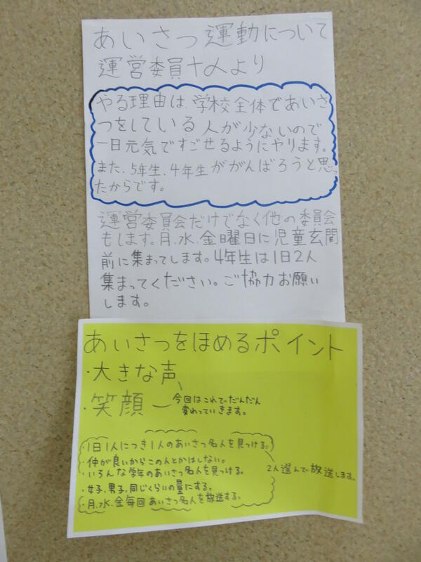 「月・水・金の朝、児童玄関のところでしようと思います。各委員会に日を割り振っています。それから、『あいさつ名人』も決めて、放送で紹介したいんです。」