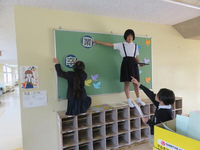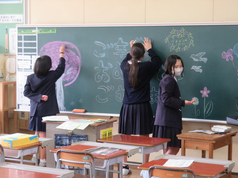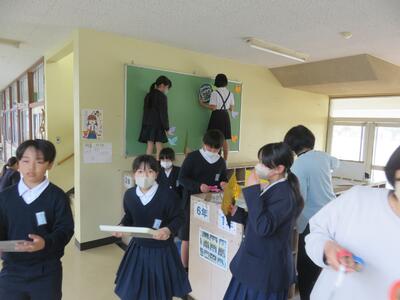 6年教室の黒板では何やらチョークアート的な作業が進んでいました。担当の子たちのセンスにお任せです。