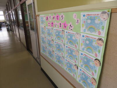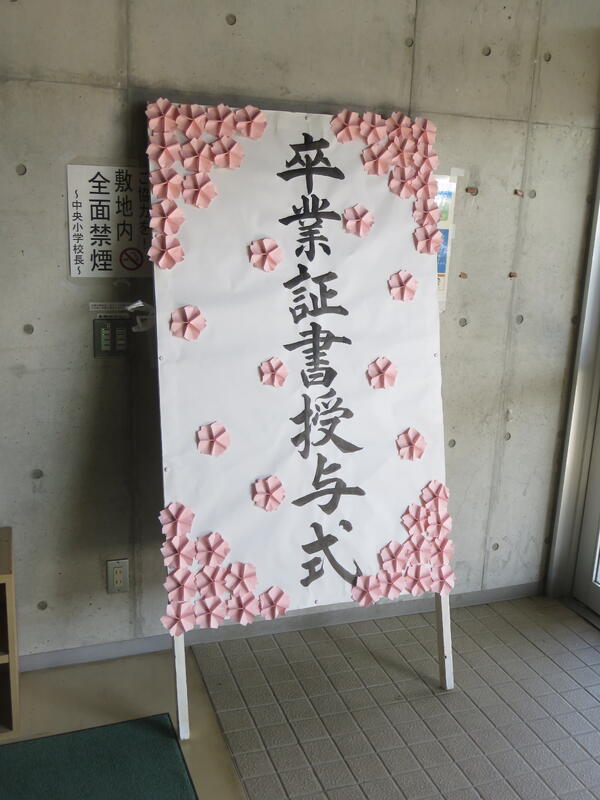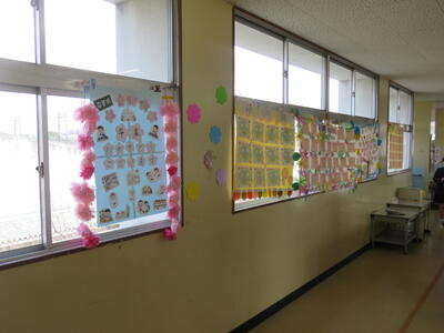 表に飾る看板です。5年生の子が花をつけたのだそうですが、完全オリジナルです。美的センスがすごいですね。こんな風に貼った方が見栄えが良いからといってデザインしたそうです。すごい!
