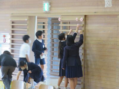 机やいすの配置はほぼ終わり、ステージ上や入り口ドアの装飾が始まっていました。ここも、どう並べるかは担当児童のセンスが生きていました。どんな装飾パターンになったのかは卒業式当日をお楽しみに。
