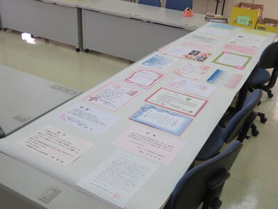 たくさんの祝詞をいただきました。きれいに貼って体育館に掲示します。来賓用の受付も事務の中村先生が着々と進めておられました。