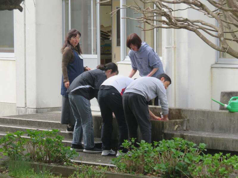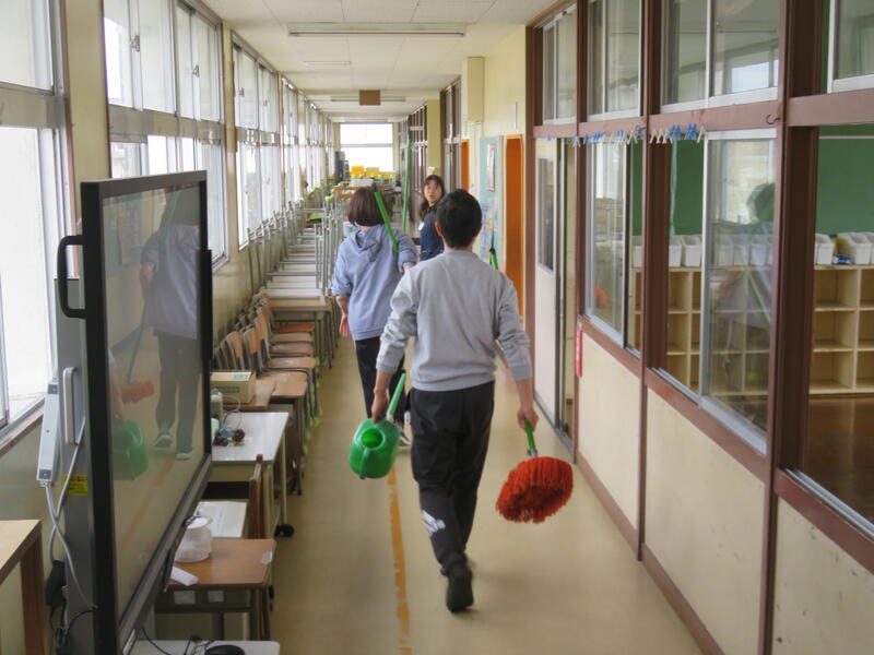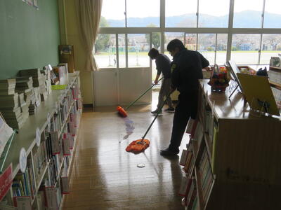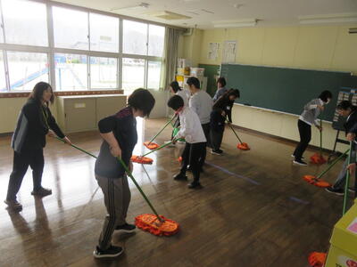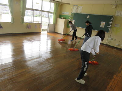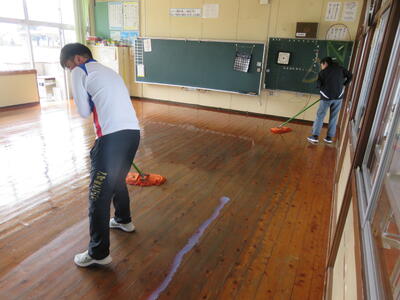 先生方のチームワークで教室の床があっという間にピカピカになりました。