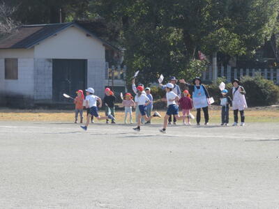 1年教室のベランダでは、1年生が応援団になって4年生の走りに声を上げています。
