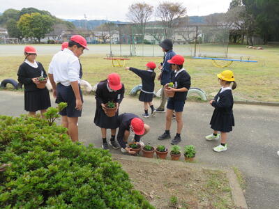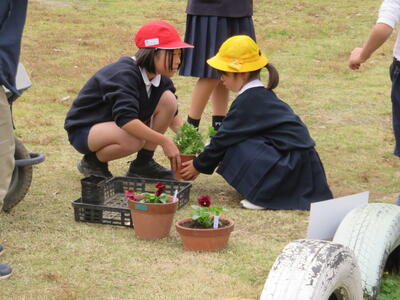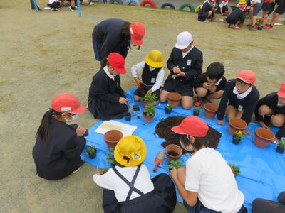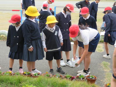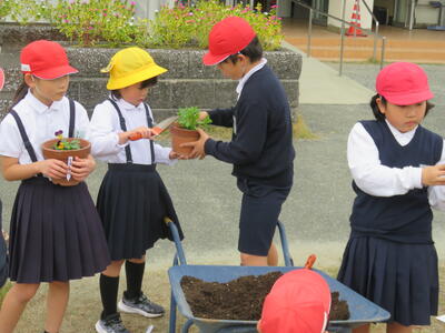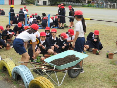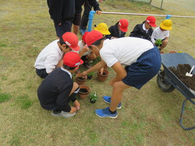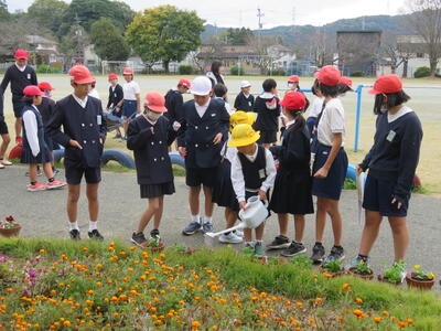 また、卒業式に飾る花を育てることを目的としているため、人権環境委員会と5年生がリーダーとなって鉢や苗、作業の進め方の説明と補助などを行いました。