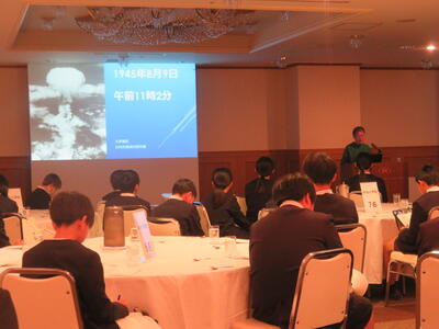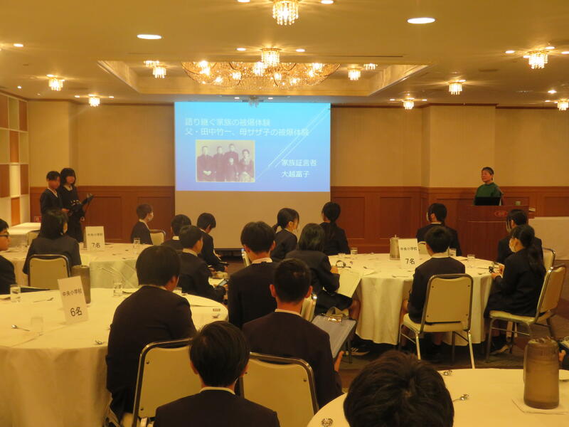 グラバー園の下にあるホテルに到着し、被爆2世の大越富子先生による被爆体験講話を伺いました。