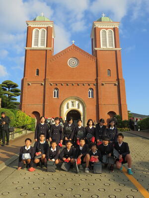 山里小学校では、「あの子らの碑」に平和を守る決意を込めて黙とうをしました。如己堂や永井隆資料館では映像をもとに原爆直後の人々の努力の足跡を感じました。美しいレンガ造りの浦上天主堂では、ステンドグラスの美しさに目を奪われながらも、復興に向けて努力を続けた人たちの思いを受け取りました。