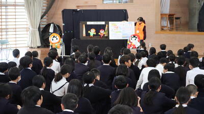 人権環境委員さんの開会の言葉で始まりました。前半は、人権SOSについての人形劇でした。