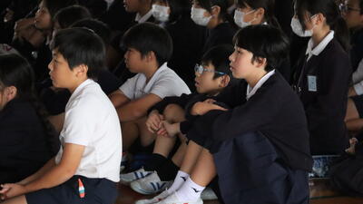 校長先生の話の冒頭で、「修学旅行、楽しみにしてた人?」と全体に問いかけると、挙手がパラパラ...