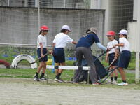テントをもう一張準備したり、低いところに山砂を入れたり、立ち入り禁止エリアや応援エリアを設置したりと、5・6年生の子どもたちがしっかり活躍してくれました。