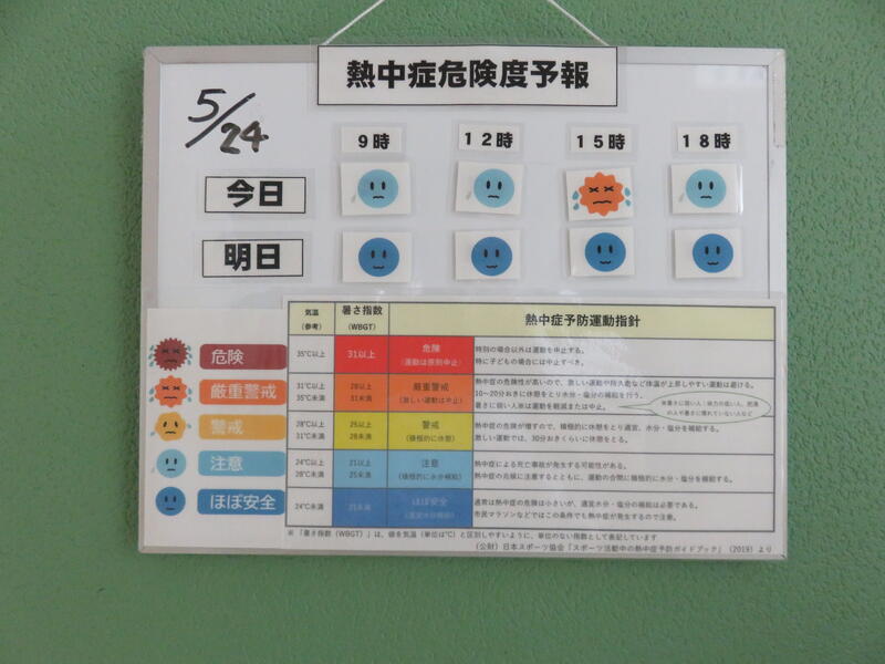 WGBTをもとに、熱中症になる可能性がわかるので、それを子どもたちにも先生方にも伝わるようにと表示をしていただいています。ありがとうございます!