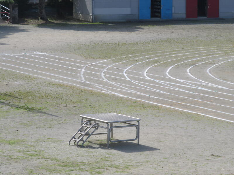 運動場では、真っ白なカーブラインと青いポイントを、銀色に輝く指令台が見つめています。