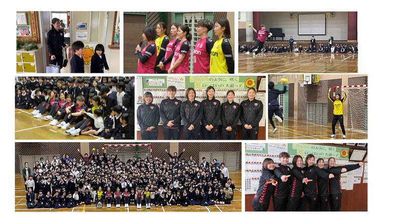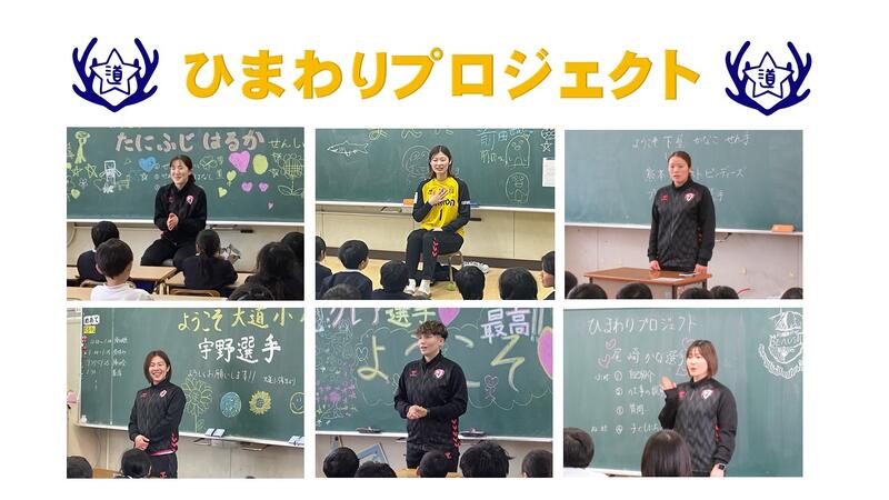 令和7年3月5日(水)に「大道小学校ひまわりプロジェクトパート3」を実施し、熊本ビューストピンディースから6名の選手(尾崎選手、宇野選手、クレア選手、下屋選手、前田選手、谷藤選手)をお招きしました。各学年の教室に入って、ハンドボール選手になった理由や現在までのキャリア、選手としての喜びや苦労等、ご自分の思いを一生懸命話してくださいました。プロスポーツ選手へのあこがれが強い子どもたちは、真剣にお話に聞き入っていました。最後は体育館にて、シュートパフォーマンスを見せていただいたり、感想交流をしたりして、楽しい時間を過ごしました。ハンドボールの指導や体力向上教室でもお世話になっている選手の皆様には、大変感謝しております。