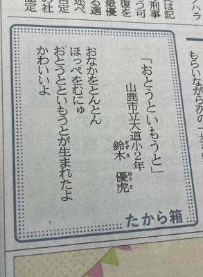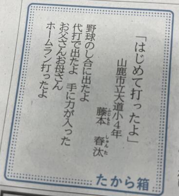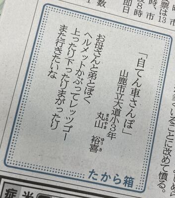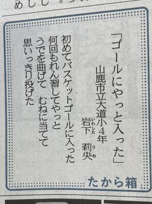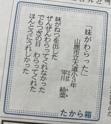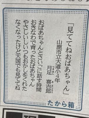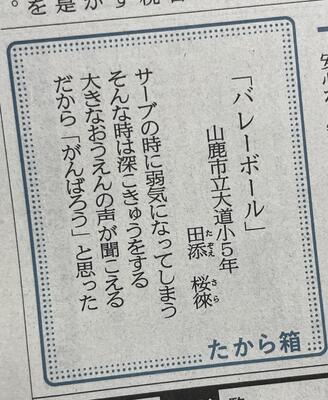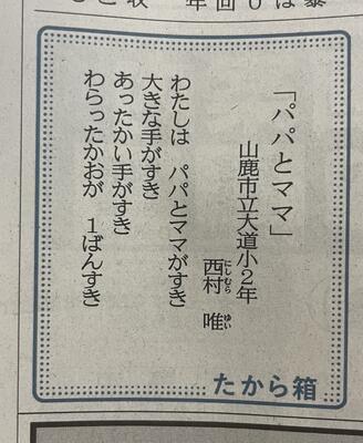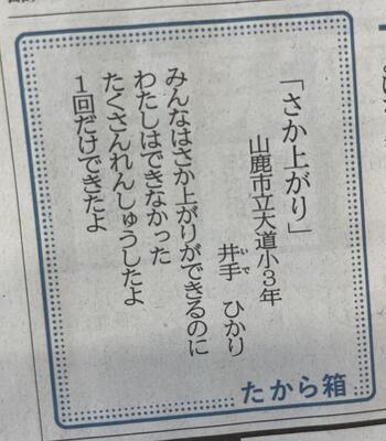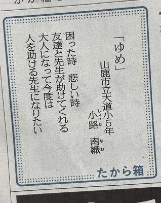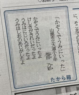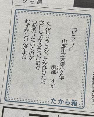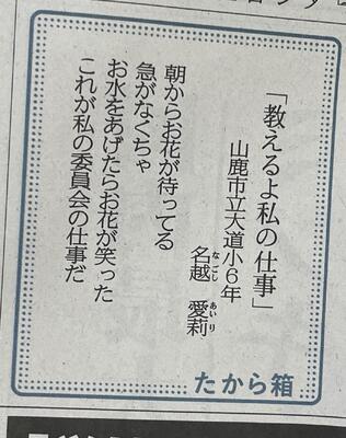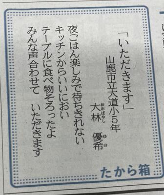本日からしばらくの間、熊本日日新聞の「たから箱」のコーナーに、大道小の子どもたちの詩が紹介されます。ぜひご覧ください!