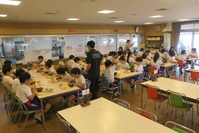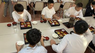 城山小学校での講話・見学を終え、昼食中です。(メニューは「長崎ちゃんぽん」!)