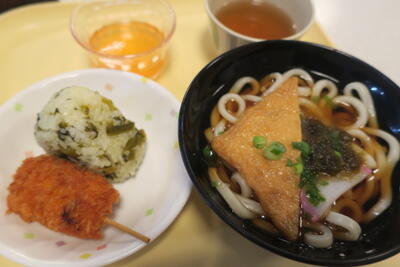 現在、昼食中(きつねうどん、串カツ、高菜おにぎり、ゼリーです!)です。午後1時から退所式を行い、学校到着は計画通り、14時20分頃になる予定です。