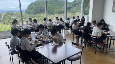 現在、昼食中(きつねうどん、串カツ、高菜おにぎり、ゼリーです!)です。午後1時から退所式を行い、学校到着は計画通り、14時20分頃になる予定です。