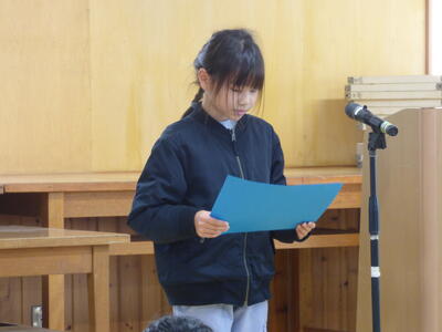 まず最初に、1年生の代表の子ども2人が2学期の思い出と3学期に頑張りたいことを発表しました。南稜高校に動物とのふれ合いに行ったことなど楽しかった思い出を伝えてくれました。